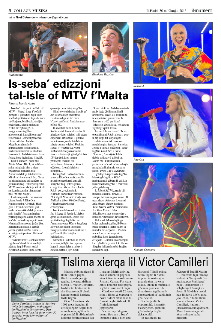 Article by Noel D'Anastas from Il-Mument 'Collage' supplement 30 June 2013, page 4 featuring the seventh edition of the Isle of MTV concert in Malta and an appreciation to Mr. Victor Camilleri, former editor of Il-Mument.